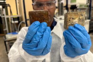 Dr Biplob Pramanik shows the difference between a concrete block coated with his team’s anti-fatberg invention compared to a block without any coating after undergoing an experiment that mimicked a sewer environment under extreme conditions to speed up the fatberg formation process. The white coloured blobs on the uncoated block are a mixture of fat, oil and grease (FOG) (Credit: Will Wright, RMIT University)