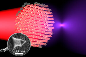 Infrared light passes through the metal lens and is converted into violet light by the material and the special surface structures and focused into a focal point. (Image: Ü.Talts / ETH Zurich)